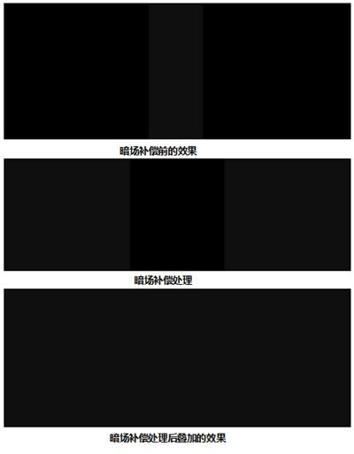 投影機(jī)的漏光,是指投影圖像為全黑色的時(shí)候,投影機(jī)仍舊有一部分光線能投射到投影幕上。這樣兩臺投影疊加以后,在純黑場的時(shí)候會出現(xiàn)一個(gè)中間亮帶。融合器需要用提升非疊加部分光強(qiáng)的方式,來抵消亮帶,這一個(gè)過程為暗場補(bǔ)償。